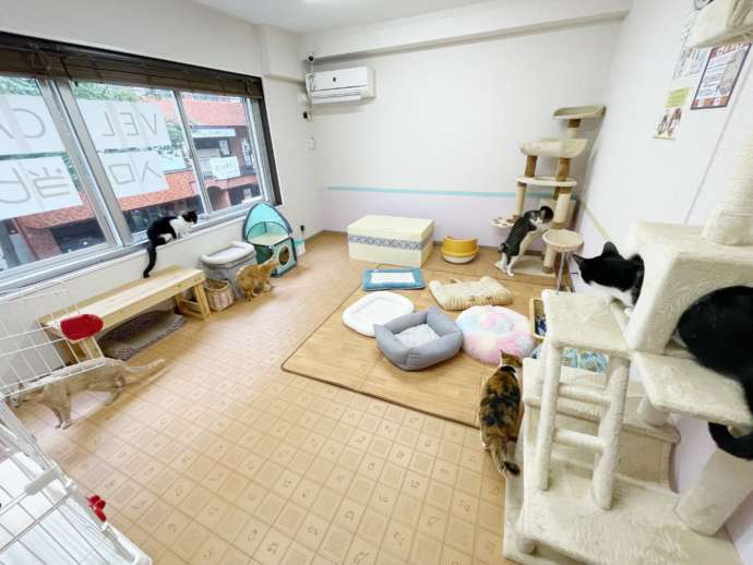 清潔感のある店内で、猫たちも落ち着いて過ごしており、譲渡希望の方も見学だけの方も歓迎されています。地域猫の支援活動にも力を入れている施設です。