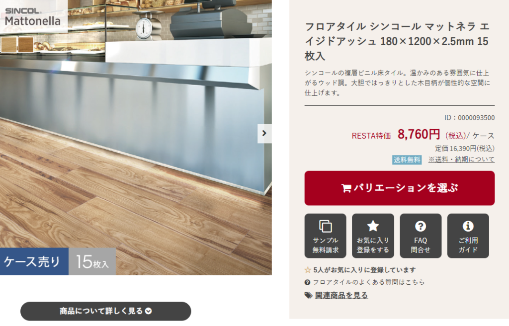 | シンコール 「マットネラ エイジドアッシュ」 | 塩ビフロアタイル | ◯ マット仕上げで適度な防滑性 | ◎ 耐水・防汚加工 | △ 消臭機能はなし | △ 接着剤施工が基本 | 1㎡あたり 3,000〜4,000円 | △ 原状回復に注意 |